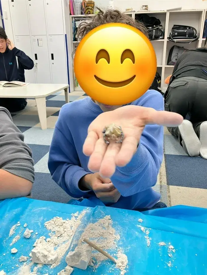 昆虫発掘キットでブロックを少しずつ削っていくと昆虫のフィギュアが出てきました! エレファソゾウカブトムシでした♪